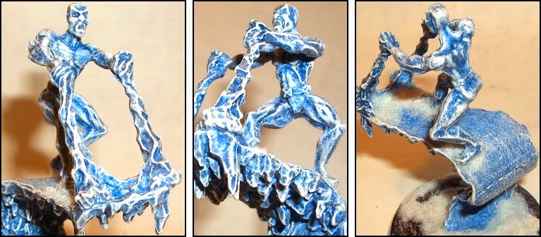 As I wanted to try and capture the deep dark icy blue of the original plastic I made sure that the acrylic wash was rather heavily applied, and then once dry, started the hour or so long process of slowly drawing a lightly charged number 10 round “Royal & Langnickel” brush over the sculpt’s raised surfaces. With some patience, I eventually found that the white paint transferred onto the founding X-Man's detail and also started to become quite powdery as well. As a result every now and then I’d just gently dab the model with the edge of the brush and create a fine soft white dust over the model.