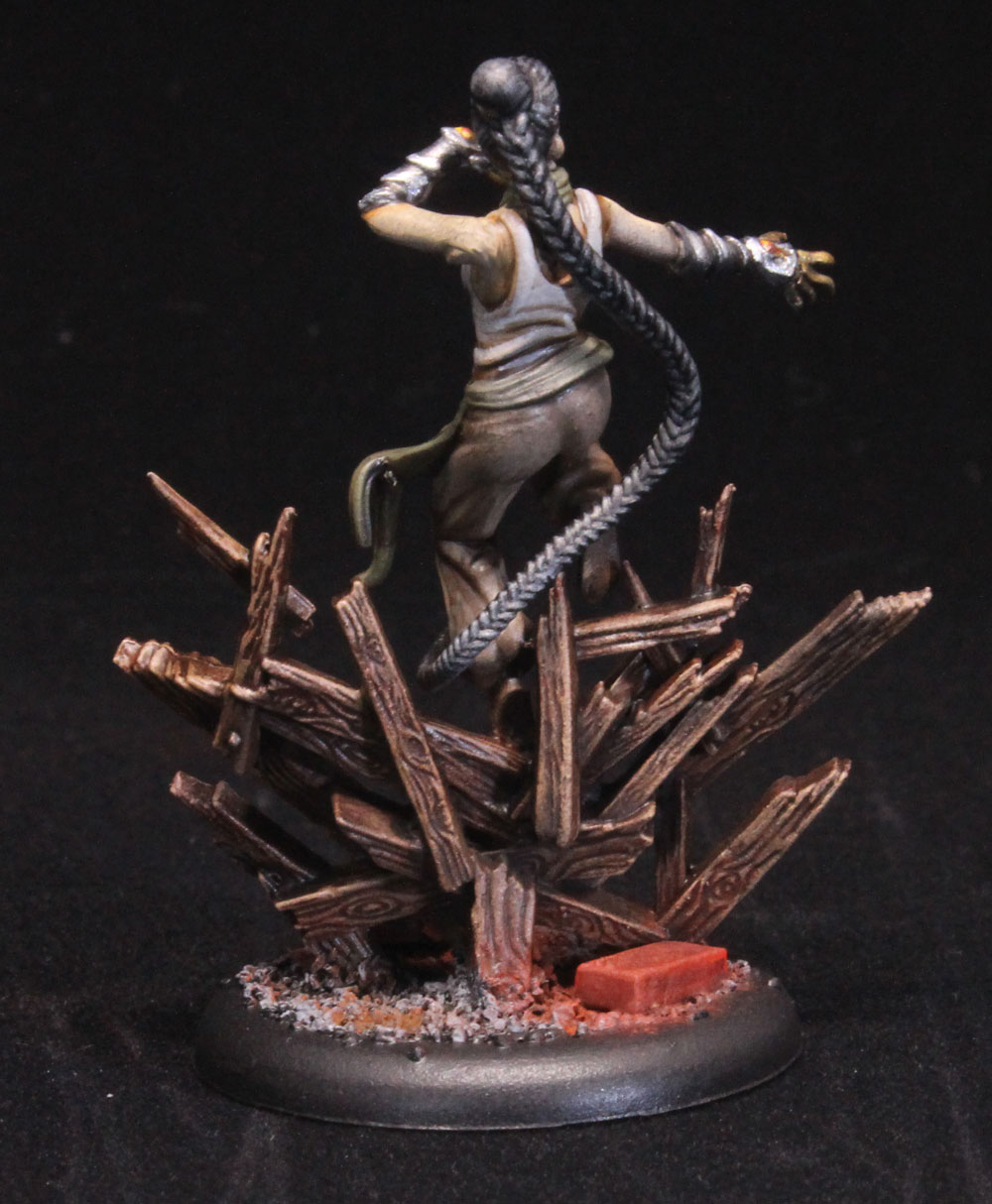 The one exception to the bases, is the base for the factions leader. She comes sculpted jumping over a wood barricade or on top of an exploding pile of wood whichever you choose to imagine it as. I looked at taking her off of it, but she just didn't look the same, so I left it in.